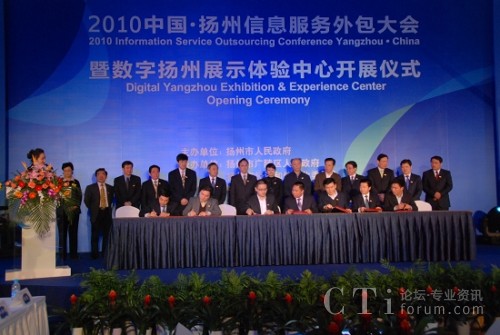 CTI論壇(ctiforum)4月22日消息(記者 潘婷婷):4月21日上午,由揚(yáng)州市人民政府主辦、揚(yáng)州市廣陵區(qū)人民政府及揚(yáng)州市經(jīng)濟(jì)和信息委員會承辦、中國國際投資促進(jìn)會支持的“2010中國·揚(yáng)州信息服務(wù)外包大會暨數(shù)字揚(yáng)州展示體驗(yàn)中心開展儀式”在名為“中國聲谷”的江蘇信息服務(wù)產(chǎn)業(yè)基地(揚(yáng)州)召開。