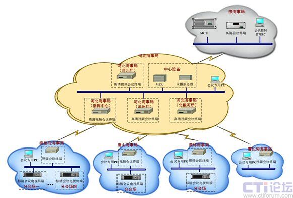 由于前期視頻會(huì)議系統(tǒng)測(cè)試時(shí)表現(xiàn)出來的良好的兼容性和出色的視音頻效果,河北海事局采用了迪威公司的高清產(chǎn)品及解決方案。按照組織機(jī)構(gòu)的分級(jí)結(jié)構(gòu),部海事局采用現(xiàn)有的高清MCU和本局部的高清終端;河北海事局部署高清MCU,既能召開本地視頻會(huì)議,又能與部海事局進(jìn)行級(jí)聯(lián),實(shí)現(xiàn)召開大會(huì)的要求,同時(shí)在本地的指揮中心、各會(huì)場(chǎng)放置1臺(tái)高清會(huì)議終端,在下屬海事處配置1臺(tái)標(biāo)清會(huì)議終端。