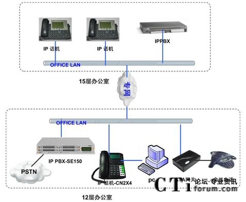 隨著企業(yè)規(guī)模的不斷擴(kuò)展,公司在15層新增約50人的辦公區(qū),需要和12層實(shí)現(xiàn)內(nèi)部通訊免費(fèi)(直撥分機(jī)號(hào)碼),出局路由沿用現(xiàn)有ISDN線路,F(xiàn)有的傳統(tǒng)的集團(tuán)電話設(shè)備已經(jīng)滿配,無法適應(yīng)企業(yè)規(guī)模的擴(kuò)張,無法跨地域組網(wǎng),不能建立多點(diǎn)分布式的內(nèi)部電話系統(tǒng),不能充分利用現(xiàn)有的IP網(wǎng)絡(luò)資源發(fā)展有助于提高企業(yè)競(jìng)爭(zhēng)力的網(wǎng)絡(luò)增值業(yè)務(wù)。