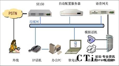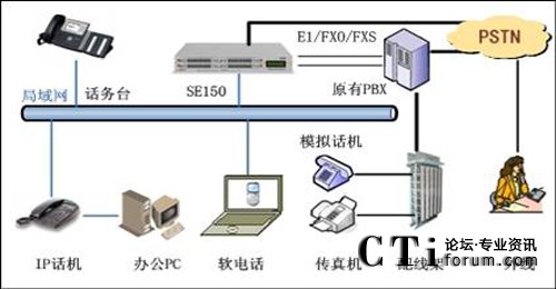 此方案適用于已經(jīng)部署了傳統(tǒng)PBX的企業(yè)。要求企業(yè)部署好數(shù)據(jù)網(wǎng)絡(luò),如果采用模擬終端,則企業(yè)的各個辦公點(diǎn)需要先將網(wǎng)絡(luò)線路和電話線路部署到位,同時企業(yè)原有的PBX要預(yù)留與SE150對接的接口。