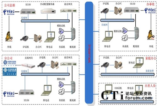 此方案適用于具有“移動辦公、頻繁出差、家庭辦公”需求的企業(yè)。系統(tǒng)要求企業(yè)內(nèi)部部署好數(shù)據(jù)網(wǎng)絡(luò),如果采用模擬終端,則企業(yè)的各個辦公點(diǎn)需要先將網(wǎng)絡(luò)線路和電話線路部署到位。如果需要應(yīng)用WIFI終端,則需要部署WIFI網(wǎng)絡(luò)。