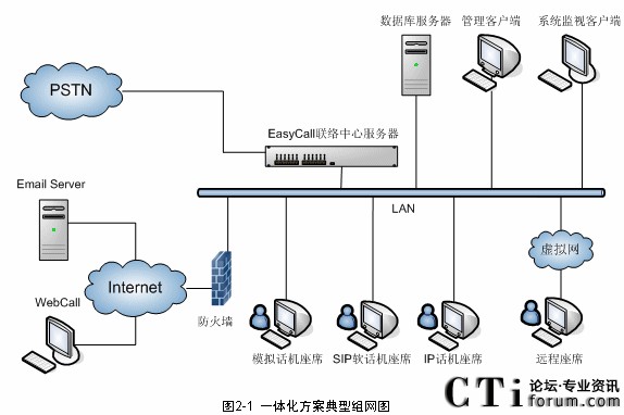 圖2-3 EasyCall聯(lián)絡中心系統(tǒng)結(jié)構(gòu)圖-一體化方案