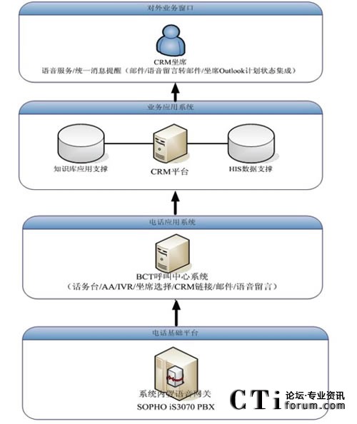 原先電話(huà)系統(tǒng)與CRM系統(tǒng)是獨(dú)立的兩個(gè)系統(tǒng),客服人員面對(duì)大量的客戶(hù),迅速的獲悉來(lái)電客戶(hù)的身份、背景資料以及歷史資料在很大程度上決定了其服務(wù)質(zhì)量。BCT呼叫中心系統(tǒng)位于PBX與CRM之間,作為一個(gè)中間的橋梁,對(duì)PBX送來(lái)的電話(huà)信息或者用戶(hù)輸入的卡號(hào)等數(shù)據(jù)進(jìn)行處理分析,對(duì)主叫號(hào)碼或用戶(hù)輸入卡號(hào)進(jìn)行識(shí)別后,傳遞給CRM;CRM檢索與其相連的HIS(醫(yī)院信息系統(tǒng))的數(shù)據(jù)庫(kù),將客戶(hù)資料以及相關(guān)的歷史記錄通過(guò)彈出網(wǎng)頁(yè)的模式,同步的顯示在坐席的計(jì)算機(jī)上,方便客服代表的輸入和后續(xù)操作,提高了效率與正確率。同時(shí),客戶(hù)代表還可以在CRM頁(yè)面中點(diǎn)擊電話(huà)號(hào)碼,通過(guò)BCT發(fā)起電話(huà)呼叫來(lái)聯(lián)系客戶(hù),來(lái)處理用戶(hù)回訪(fǎng)等工作。