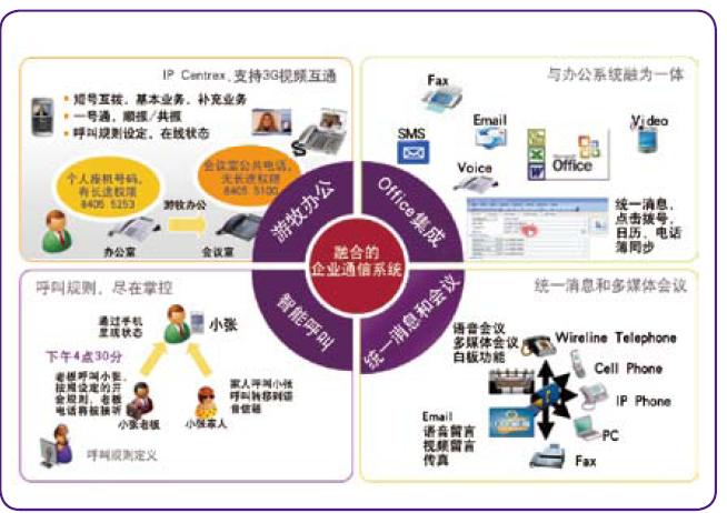 諾基亞西門子通信綜合企業(yè)通信平臺(tái),針對(duì)網(wǎng)絡(luò)未來(lái)發(fā)展及企業(yè)用戶對(duì)下一代語(yǔ)音和融合多媒體業(yè)務(wù)的需求,提出了專業(yè)的企業(yè)通信整體解決方案。該方案可以通過(guò)靈活的功能組合幫助運(yùn)營(yíng)商實(shí)現(xiàn)一體化業(yè)務(wù)提供,為企業(yè)和用戶提供良好的統(tǒng)一使用體驗(yàn),并實(shí)現(xiàn)自我管理。方案集成了豐富的企業(yè)通信和辦公系統(tǒng)的功能,如商務(wù)群業(yè)務(wù)IPCentrex、視頻、托管辦公、會(huì)議、即時(shí)消息、多媒體協(xié)同等。利用該方案運(yùn)營(yíng)商可以根據(jù)用戶需求實(shí)現(xiàn)快速部署,無(wú)縫地融合現(xiàn)有網(wǎng)絡(luò),實(shí)現(xiàn)現(xiàn)有系統(tǒng)向FMC/IMS系統(tǒng)的平滑過(guò)渡。