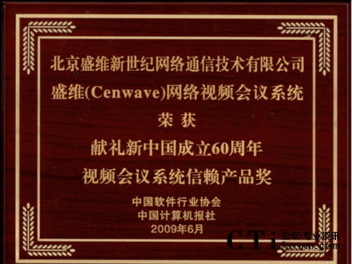 在剛剛結束的第十三屆中國國際軟件博覽會(以下簡稱軟博會)上,盛維(Cenwave)新世紀應邀出席了2009中國軟件服務業(yè)發(fā)展高峰論壇暨開幕式,并且核心產品盛維(Cenwave)網絡視頻會議系統(tǒng)榮膺“獻禮新中國成立60周年•中國軟件行業(yè)視頻會議系統(tǒng)信賴產品獎”。這一經過企業(yè)申報、候選投票、專家評審、發(fā)布頒獎等嚴格流程評選出來的獎項,傳達了用戶的真實心聲,反映了盛維(Cenwave)網絡視頻會議系統(tǒng)已經被越來越多的客戶所信任。