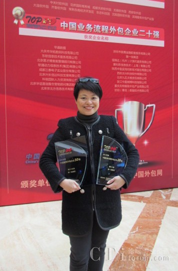 在2012中國服務(wù)外包領(lǐng)軍者年會的頒獎典禮上,第一線集團(tuán)華北區(qū)總經(jīng)理陳施慧女士上臺領(lǐng)取了這兩個獎項(xiàng)。