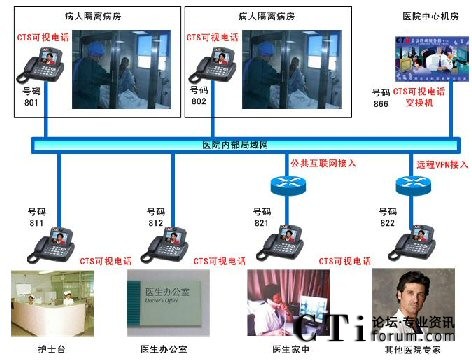 對于隔離病房的觀察,目前的實(shí)現(xiàn)可以使用遠(yuǎn)程視頻監(jiān)控,或者使用電腦方式來遠(yuǎn)程視頻交流。視頻監(jiān)控缺點(diǎn)無法實(shí)時(shí)與病人交流,使用電腦交流則操作比較繁瑣。CTS提出使用可視電話的方案來彌補(bǔ)當(dāng)前的缺點(diǎn):實(shí)時(shí)與病人交流,可視電話使用操作簡單。