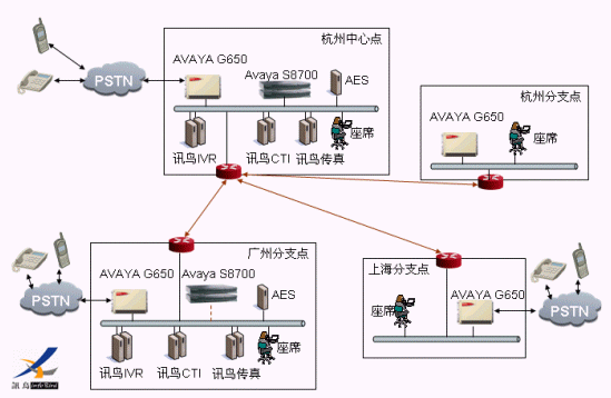 S8710、一套訊鳥CTI/IVR/傳真集中控制,其他各點通過G650接入。其中廣州分支點由于座席數(shù)較多,單獨部署一臺AES服務(wù)器、一套訊鳥CTI/IVR/傳真服務(wù)器。廣州點的一套AVAYA