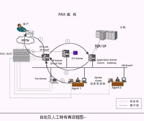 在線傳真(OneCallFAX),客戶用傳真機(jī)打電話到CallCenter,做過(guò)一些交易后要求傳真服務(wù),就在傳真機(jī)上按鍵切換到傳真模式,F(xiàn)AX通過(guò)同一條線發(fā)回,這種情況是同一通電話的在線傳真服務(wù)。