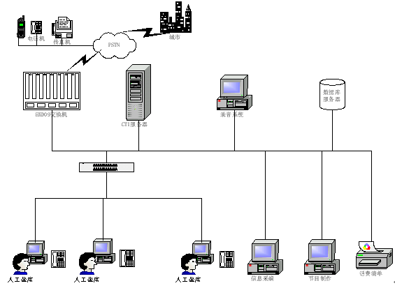 人工坐席平是通過采用HXD99系列智能可編程交換機提供的軟鍵盤接口技術和TCP/IP網絡協議,為坐席人員提供的操作平臺。通過計算機提供的友好界面,可方便的實現接聽來話、轉接來話、來話轉移、會議、呼出外線、等一系列用戶來話的操作和交互的語音播放。同時,通過后臺強大的數據庫連接,可以方便、快捷實現信息查詢。