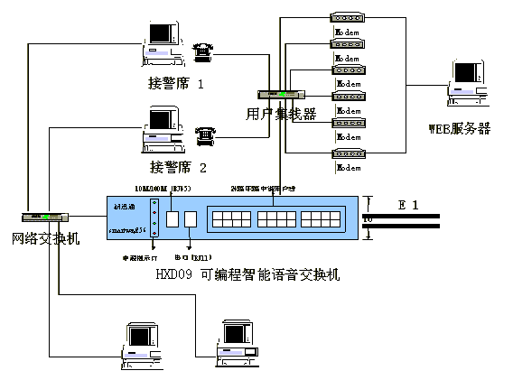 綜合接警平臺主要由hxd09可編程智能語音交換機和計算機網(wǎng)絡兩部分組成,交換機負責110、119、122報警電話的接入與分流及調(diào)度呼出等功能;計算機網(wǎng)絡則完成110、119、122報警信息的顯示、數(shù)據(jù)儲存、統(tǒng)計及信息查詢、發(fā)布功能。