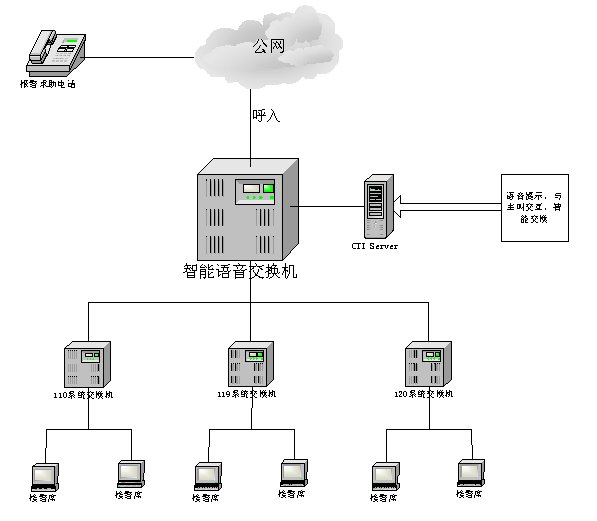公安綜合信息呼叫中心系統(tǒng)就是在呼叫中心基礎上利用先進的CTI技術,將現(xiàn)存和即將開通的信息系統(tǒng)有機地整合起來;即把數(shù)字語音技術、計算機網(wǎng)絡技術、通信、交換等先進技術結合起來,結合公安業(yè)務特點,擴展和增強公安信息應用系統(tǒng)的功能,使現(xiàn)有數(shù)據(jù)庫資源得到充分利用;還可使一部分可以公開或應該公開的公安信息向社會提供增值服務,如出入境辦理查詢、身份證查詢、車輛駕駛員信息查詢等。本系統(tǒng)以110、119、122綜合報警服務為龍頭,以各項公安工作信息化為主要內(nèi)容,以公安計算機信息、通信網(wǎng)絡為依托,以對內(nèi)提供信息多種方式綜合利用、對外提供社會服務為目的,以當前先進的INTENNET、CTI、數(shù)據(jù)庫技術為手段,建立起的對內(nèi)統(tǒng)一受理、指揮調(diào)度、快速反應、協(xié)同作戰(zhàn);對外警務公開、信息咨詢、查詢、投訴舉報為一體的公安綜合信息呼叫中心系統(tǒng)。