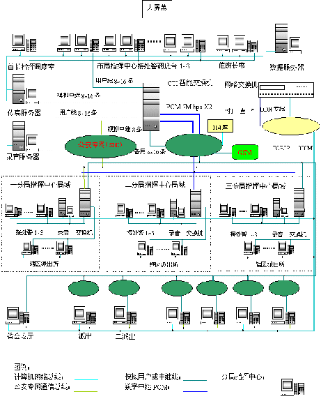 - 樹立大網(wǎng)絡概念:采用先進的通訊、計算機網(wǎng)絡技術(采用CTI可編程交換技術),利用現(xiàn)有的通信資源,實現(xiàn)市局指揮中心與消防大隊、交警大隊、各派出所的計算機網(wǎng)絡及相關領導辦公室計算機大聯(lián)網(wǎng);形成全市范圍內(nèi)110、119、122有線、無線全方位立體調(diào)度語音通道大網(wǎng)。