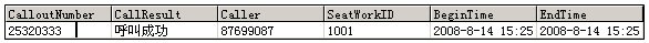 當(dāng)座席E1呼入時(shí), 接收主叫號碼(87699078), 同時(shí)發(fā)出呼叫(主叫號碼為87699078,被叫為25320333),并通過預(yù)測撥號識別各類呼叫結(jié)果,如:忙音、空號、或無人接聽等,只將有效的通話轉(zhuǎn)接至業(yè)務(wù)人員,同時(shí)將呼叫結(jié)果寫入數(shù)據(jù)庫UT_IMCALL表(如下圖),