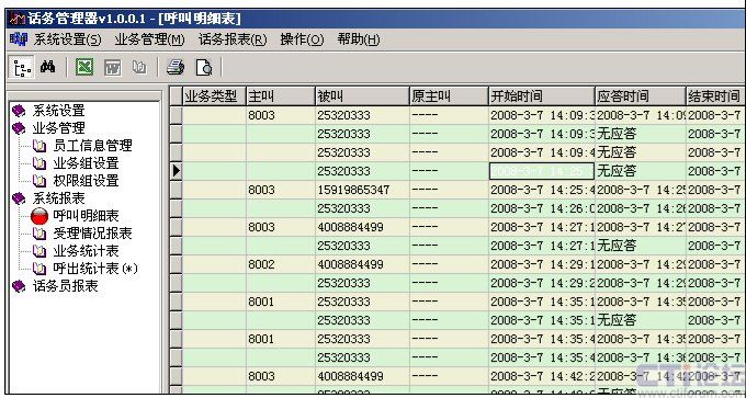 系統(tǒng)提供通話數(shù)據(jù)信息及統(tǒng)計(jì),包括: 主被叫號碼 通話時(shí)長 呼出時(shí)長 等待時(shí)長 呼入呼出次數(shù) 話務(wù)員工作日報(bào) |