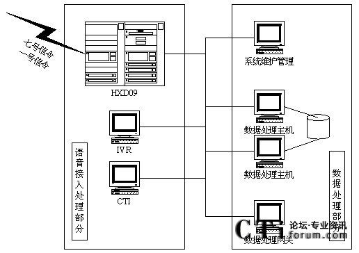 語音接入處理部分主要完成用戶的語音話路接入功能。其中:HXD09語音交換機可以支持七號信令和一號信令的數(shù)字E1線路的接入。HXD09的IVR完成自動業(yè)務(wù)受理功能,實現(xiàn)系統(tǒng)7*24小時不間斷服務(wù)。CTI完成對排隊機的監(jiān)視、控制任務(wù),并能夠?qū)崟r的提供每個語音通道的信息配合IVR完成自動繳費業(yè)務(wù)的實現(xiàn)。