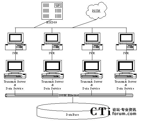 系統(tǒng)硬件的兩大部分通過100M局域網(wǎng)連接起來,以語音接入處理部分為聯(lián)系手段、以數(shù)據(jù)處理部分為信息處理平臺,相互配合、有機結(jié)合,為廣大運營商通信用戶提供方便、可靠的自動繳費服務(wù)。