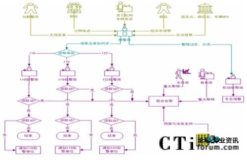 公安指揮綜合管理系統(tǒng)針對(duì)公安接處警的工作流程為:報(bào)警接收、報(bào)警識(shí)別、指揮調(diào)度、派警發(fā)送、處警記錄、全過程語音文本信息監(jiān)督、統(tǒng)計(jì)分析。指揮調(diào)度中又包括預(yù)案編制調(diào)用、有無線通信調(diào)度、實(shí)時(shí)監(jiān)控信息接收。系統(tǒng)工作流程如下圖所示: