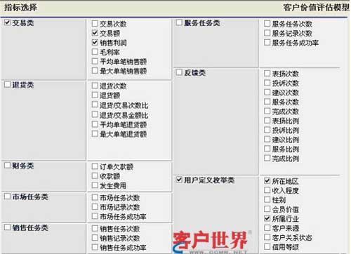 TurboCRM在長(zhǎng)期支持CRM應(yīng)用實(shí)踐過程中,總結(jié)出一套完整實(shí)用的客戶價(jià)值評(píng)估模型,評(píng)估指標(biāo)包括交易類、財(cái)務(wù)類、服務(wù)類、反饋類、枚舉類、自定義指標(biāo)等(如圖),結(jié)合不同的指標(biāo)可以幫助企業(yè)評(píng)估客戶價(jià)值。