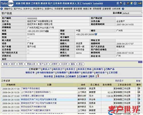 信息整合是CRM系統(tǒng)實(shí)現(xiàn)對(duì)客戶信息進(jìn)行管理的基礎(chǔ),將客戶的各類信息進(jìn)行關(guān)聯(lián),當(dāng)查詢某個(gè)客戶時(shí),與該客戶相關(guān)的歷史接觸記錄、交易記錄都可一目了然地展現(xiàn)出來,也可以方便地進(jìn)行相關(guān)信息的及時(shí)錄入。(如下圖)