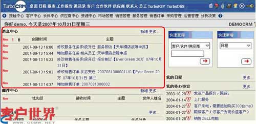 TurboCRM系統(tǒng)的消息中心是協(xié)同工作的核心,當(dāng)客戶接觸過程有進(jìn)展時(shí),相關(guān)員工的桌面會(huì)出現(xiàn)消息提醒,以方便員工及時(shí)地了解客戶動(dòng)態(tài)。