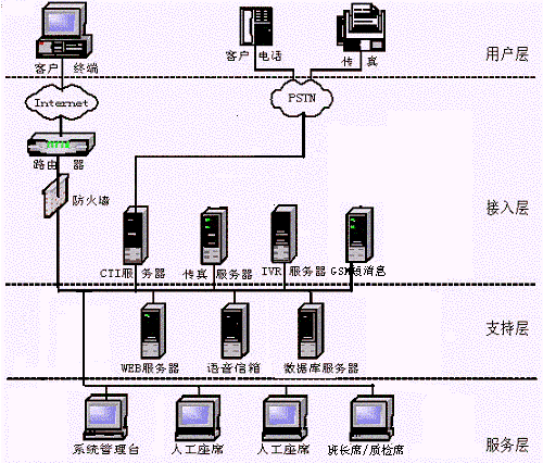 CTI服務器、IVR/FAX服務器、人工座席、管理工作站(計費、統(tǒng)計、系統(tǒng)管理、網(wǎng)絡(luò)管理)、數(shù)據(jù)庫服務器、WWW服務器、網(wǎng)絡(luò)系統(tǒng)等,其網(wǎng)絡(luò)結(jié)構(gòu)圖如下: