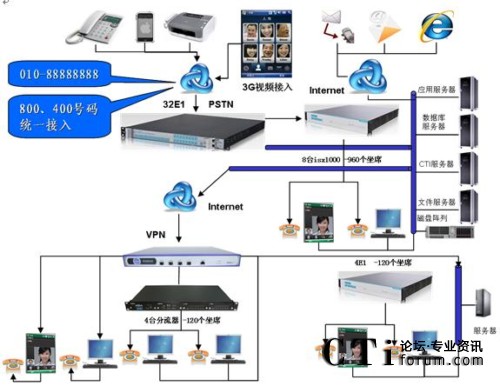 系統(tǒng)接入運營商的數(shù)字中繼、Internet寬帶網(wǎng)絡(luò),單機(jī)最大可提供本地960個模擬坐席。通過VPN(單獨組建VPN或者利用防火墻VPN也可)可將IP坐席分布到能夠聯(lián)通網(wǎng)絡(luò)的局域網(wǎng)任意一端口電腦或者部署到傳統(tǒng)Internet廣域互聯(lián)網(wǎng)的另一城市的分支機(jī)構(gòu)。