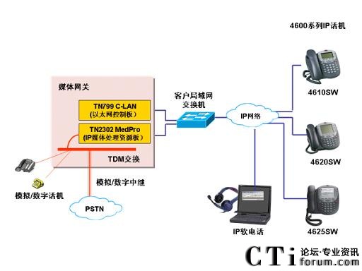 安裝于媒體網(wǎng)關(guān)上的TN799 C-LAN以太網(wǎng)控制板和TN2302 MedPro媒體處理資源板均提供標(biāo)準(zhǔn)的10/100Base-Tx以太網(wǎng)端口連接到客戶局域網(wǎng),并根據(jù)客戶網(wǎng)絡(luò)配置相應(yīng)的IP地址。