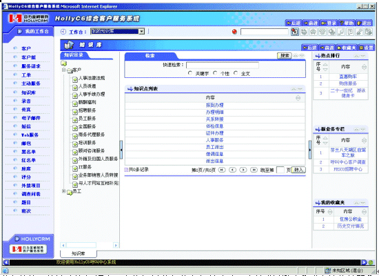 | 業(yè)務(wù)咨詢:快速查詢知識點(diǎn),定位相關(guān)業(yè)務(wù)信息解答客戶。支持“關(guān)鍵字”、“個性化編碼”、“全文檢索”、“熱點(diǎn)排行”、“個人收藏夾”等多種信息查詢方式。 |