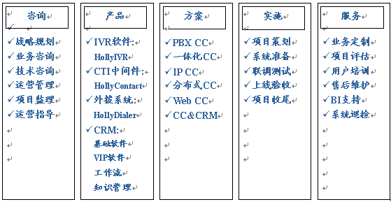 HollyC6支持的業(yè)務(wù)類型包括:客戶服務(wù)中心、咨詢熱線、電子商務(wù)中心、服務(wù)受理中心、預(yù)訂中心、電話營銷中心、技術(shù)支持中心等。