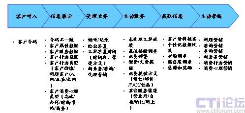 在上面的流程中,將一次客戶接觸,轉(zhuǎn)變?yōu)橐淮稳娴目蛻艋訖C會,通過對客戶信息360度的洞察和客戶的互動溝通,在為客戶提供基本服務(wù)的同時,根據(jù)客戶的基本資料、歷史消費數(shù)據(jù)等,挖掘客戶的隱性需求,從而有選擇的開展客戶關(guān)懷、客戶信息收集、客戶維系、主動營銷活動。下面以一個電信運營商的客戶呼入流程為例,說明在一個以客戶為中心的客戶接觸流程中,坐席代表可以開展的客戶接觸活動(圖4)。