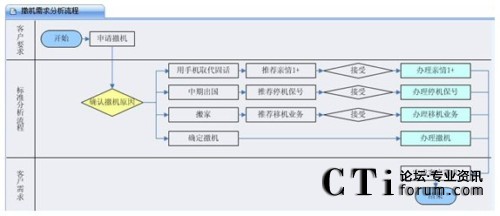 客戶呼入之后,座席人員要做的第一件事情就在IT系統(tǒng)的支持下先去捕獲客戶訴求,不用擔(dān)心座席會混淆相似的業(yè)務(wù)類型,因為呼叫中心針對典型的業(yè)務(wù)訴求會做出非常詳盡的引導(dǎo)流程,相似的或者關(guān)聯(lián)的業(yè)務(wù)類型在此流程中會體現(xiàn)出來,座席人員可以點擊,快捷地出入于各業(yè)務(wù)類型的引導(dǎo)圖,通過比較、判斷,最終定位出客戶真正訴求。例如下文客戶呼入本來想做“撤機”業(yè)務(wù),通過業(yè)務(wù)引導(dǎo)圖,最終定位到了客戶的真正訴求,辦理了停機保號業(yè)務(wù)或者移機業(yè)務(wù)。