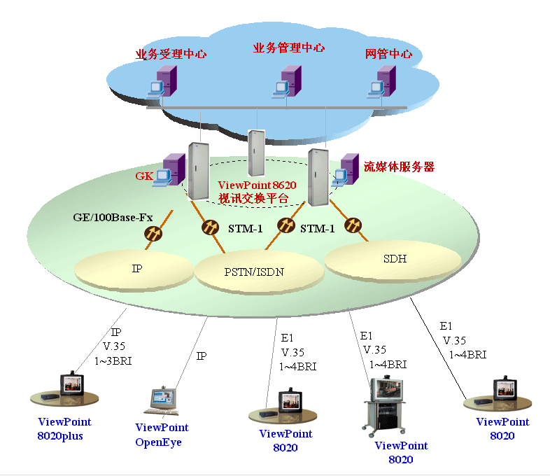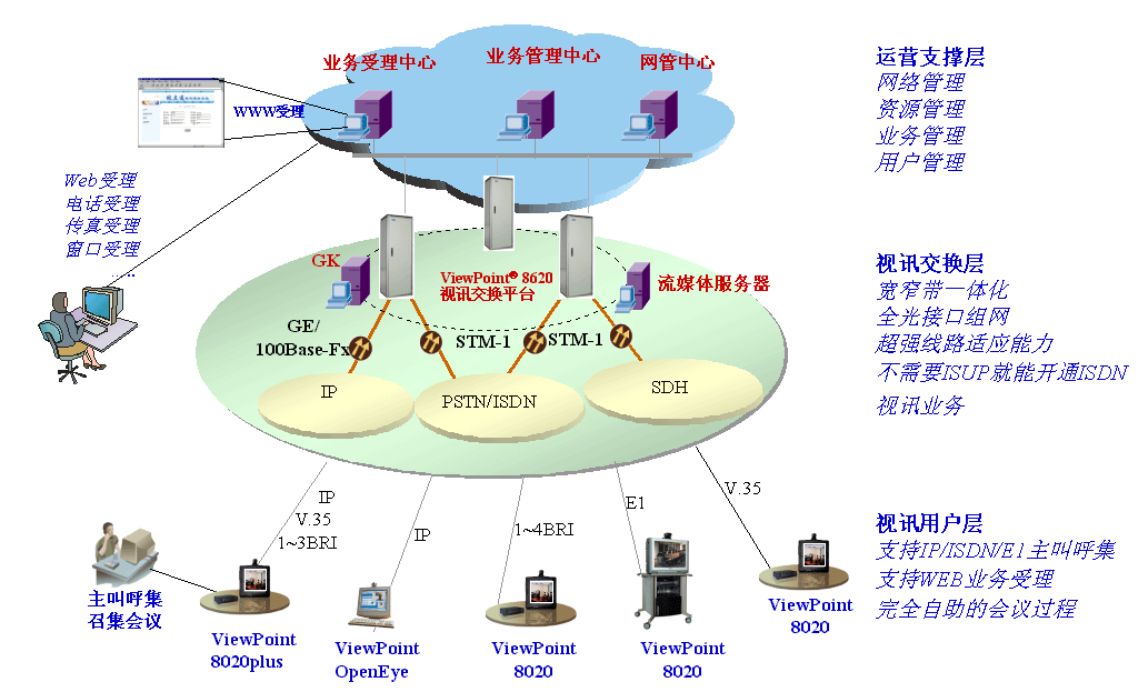 面對公眾視訊業(yè)務(wù)發(fā)展的契機(jī),由于基于窄帶H.320的視訊系統(tǒng)較為成熟,而基于IP網(wǎng)的H.323系統(tǒng)被普遍看好,ISDN目前是最方便的公眾視訊系統(tǒng)接入手段,相對于其他接入方式(如E1、DDN、FR、ATM、IP等)使用方便,可方便通過撥號方式與任何聯(lián)網(wǎng)地區(qū)建立會議。ViewPoint 8620視訊交換平臺采用寬窄帶一體化設(shè)計,可為各行各業(yè)用戶提供完備的一體化解決方案,不僅能提供大容量ISDN用戶撥號接入,還能提供大容量的E1/V.35/IP方式接入。公眾視訊業(yè)務(wù)的發(fā)展,將視訊業(yè)務(wù)從單純?yōu)樯贁?shù)特定用戶群提供遠(yuǎn)程會議服務(wù),轉(zhuǎn)而面向公眾,為各行各業(yè)提供視訊業(yè)務(wù)。