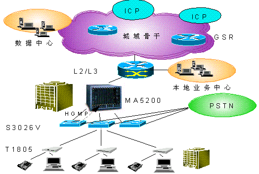 另外,Quidway S3026V可與華為公司MA5200等組網(wǎng),通過HGMP(Huawei Group Management Protocal)華為組管理協(xié)議,S3026V與華為MA5200、S3526等上行管理設(shè)備共同提供寬帶接入網(wǎng)的整網(wǎng)解決方案,實現(xiàn)對Quidway(R) S3026V的集中管理,為用戶提供更廣泛、更豐富的業(yè)務(wù)功能,充分體現(xiàn)華為公司在寬帶網(wǎng)絡(luò)上具有的“可運營、可管理、可維護”優(yōu)勢。 如圖2所示: