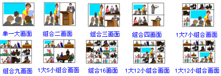 華為高清視訊系統(tǒng)采用了數(shù)字多畫(huà)面合成技術(shù),系統(tǒng)全面提供2、3、4、6、8、9、13、16等不同的9種畫(huà)面組合模式,在會(huì)議過(guò)程中,多畫(huà)面的格式可以通過(guò)主席或管理員隨意切換,同時(shí)會(huì)議過(guò)程中也可以在單多畫(huà)面之間的自由切換。支持的多畫(huà)面組合模式如下: