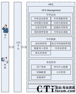 Server)提取HPS Management中導(dǎo)入的客戶(hù)數(shù)據(jù),自動(dòng)批量的執(zhí)行外呼任務(wù)。客戶(hù)呼通后,簽入HPS Agent 的話務(wù)員為客戶(hù)提供語(yǔ)音服務(wù)。