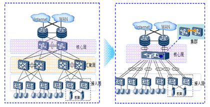 減化的網絡通過集群,網絡自動化,網絡智能化技術,消除網絡中的可靠性隱患,如STP等。把網絡的故障收斂時間從秒級別提高到毫秒級別。