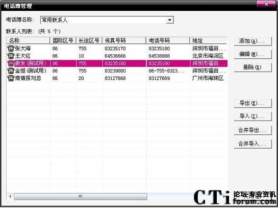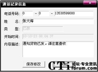 在A8電腦傳真機的電話商務通軟件主界面,雙擊通話記錄中的某個客戶號碼,或選中該號碼點擊下面的通話歷史按鈕,您與該客戶的通話歷史便一覽無余。選中某個記錄,您可以對其進行編輯(添加姓名、備注該次通話的內容),刪除,軟件撥出,加入電話簿等操作。