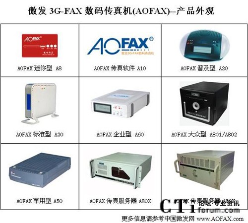 AOFAX系列電腦傳真產(chǎn)品擁有最齊全的型號,包括免費使用的AOFAX傳真軟件A10、SOHO/商旅人士便攜使用的AOFAX迷你型數(shù)碼傳真機A8、單電腦使用的AOFAX普及型數(shù)碼傳真機A20、4用戶環(huán)境的AOFAX標準型電子傳真機A30、軍警使用的AOFAX軍用型傳真系統(tǒng)A50、公安專用傳真服務器A51、營運版網(wǎng)絡傳真服務期A52、不限用戶數(shù)目的AOFAX企業(yè)型網(wǎng)絡傳真機A60、1至2線的AOFAX大眾型傳真服務器A801和A802,2至256傳真線路多種規(guī)格的AOFAX專業(yè)型傳真服務器A80X、跨區(qū)域大型公司使用的集團傳真系統(tǒng)和行業(yè)解決方案等,價格從幾百到幾十萬元,可適應各類型客戶的需求,以下為AOFAX全系列產(chǎn)品外觀圖。