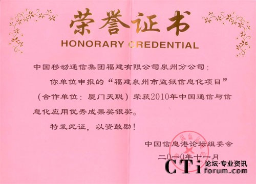 5.榮獲“2010年中國(guó)通信與信息化應(yīng)用優(yōu)秀成果獎(jiǎng)”銀獎(jiǎng)。