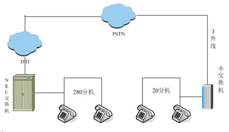 據(jù)了解,該門業(yè)企業(yè)本次將北京的兩個辦公地點(diǎn)(總部和廠區(qū))率先進(jìn)行了嘗試。之前兩處均NEC交換機(jī),中繼為電信DID接入(線數(shù):300+)尚有20個號碼可用。企業(yè)希望能加強(qiáng)通訊管理,將廠區(qū)通訊系統(tǒng)與總部通訊系統(tǒng)合二為一,費(fèi)用和管理均在總部進(jìn)行。