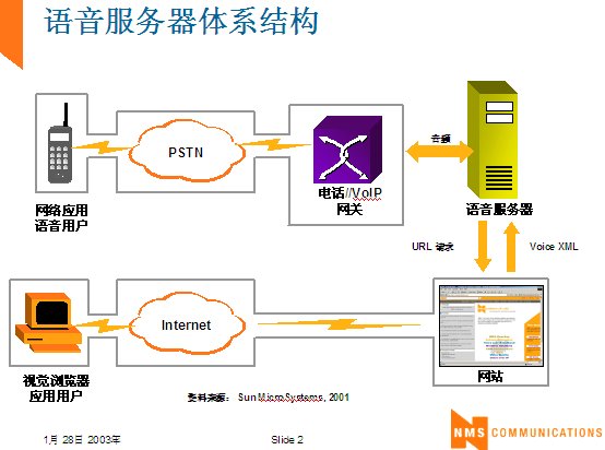 世界上最古老的用戶界面--人類語言終于在二十一世紀(jì)借助于VoiceXML,一種語音可擴(kuò)展標(biāo)記語言發(fā)展成熟起來。作為世界上第一個真正的語音通信標(biāo)準(zhǔn),它定義了應(yīng)用開發(fā)商向用戶提供新型信息訪問服務(wù)的方式。通過這種服務(wù),用戶在任何地方,都可以通過電話或任何移動設(shè)備,虛擬訪問任何信息。VoiceXML正在被廣泛應(yīng)用于旅游、金融與信息服務(wù)等行業(yè)的各種業(yè)務(wù)領(lǐng)域中,甚至是政府部門與市政機(jī)構(gòu),全球的無線運(yùn)營商等。