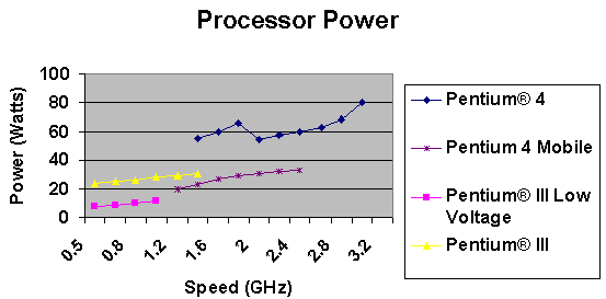 一個32W的功率讓一顆Pentium 4的處理器可以跑到1.7GHz,要增加處理器的速度則讓我們必須增加散熱片的大小,或是降低最大操作溫度、增強(qiáng)吹風(fēng),或者是這些方法中的某種組合。下一代的設(shè)計(jì)目標(biāo)會是達(dá)到3GHz的P4處理器,那表示我們必須要能處理65W的熱能。下一代的卡板由于將具備更加多樣豐富的功能與規(guī)格,勢必難以在增加散熱片大小上做文章,多出來的33W將必須通過增加風(fēng)速和降低最大操作溫度來達(dá)成。每分鐘450英尺的風(fēng)速,散熱片熱阻0.45°C/W,周邊操作溫度可被降到40°C。如果給定這樣的條件,處理器最大的功率將是