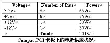 CompactPCI卡板透過J1/J2的連接器來接收電源。有8個3.3V、6個5V、1個+12V、1個-12V的電源接腳。這些接腳供應(yīng)1安培 IEC61076-4-101規(guī)格的電。每個接腳一安培的限制是保守的,而且某種程度上會誤導(dǎo)讓人以為所有的接腳可以在周邊溫度70°C的狀況下去接一安培的電流。在現(xiàn)實(shí)狀況中并不是所有連接器中的接腳都負(fù)載到最大的電流量,事實(shí)上大部分的CompactPCI接腳都是負(fù)載在以毫安為單位的電流范圍中。70°C一安培的限制,是基于流過接腳的電流所產(chǎn)生的熱。當(dāng)電流增加時,也加大了跨過接腳的電位差。產(chǎn)生的熱是一種電壓和電流的函數(shù),電壓和電流的增加會使連接器接腳的溫度上升。在CompactPCI中有最顯著電流量的的接腳,是電源供應(yīng)器接腳。如果設(shè)計(jì)者假設(shè)J1/J2連接器中的其它所有接腳都有電流負(fù)載,每一個接腳的最大電流則會是在40°C 2.5Amps, 這個信息可以在IEC61076-4-101的規(guī)格中的4.2.3中被找到。在每個接腳2.5安培的條件下,板卡可取得的功率大小如下表所示,此表顯示出卡板的設(shè)計(jì)者最多可以從J1/J2連接器中拉出200Watts的電。
