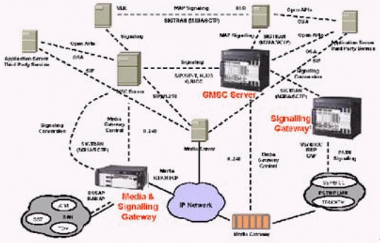 本例中的媒體網(wǎng)關(guān)控制器(MGC)終結(jié)所有的信令,包括直接傳輸?shù)暮屯ㄟ^IP的信令,完成如一個SIP電話向PSTN網(wǎng)絡(luò)發(fā)送信號之類的信令互通,還對打到VoIP網(wǎng)絡(luò)的呼叫進(jìn)行鑒權(quán)和選擇路由,并提供計(jì)費(fèi)信息。這個MGC還通過SIP/SIP-T,H.323或Q.BICC與其他的MGC通信。