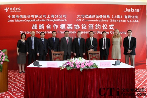 CTI論壇(ctiforum)6月23日消息(記者 楊佳林):上!蝾I(lǐng)先的創(chuàng)新耳麥解決方案提供商大北歐公司(GN Netcom)與中國電信上海公司(以下簡稱上海電信)今日隆重舉辦了 “戰(zhàn)略合作框架協(xié)議簽約儀式”。上海電信資深經(jīng)理花銳強(qiáng)、大北歐公司亞太區(qū)總裁Mark Leigh,及雙方公司高層領(lǐng)導(dǎo)共同出席了此次慶典。Mark Leigh先生還代表了大北歐公司將Edouard Suenson先生——“將電報(bào)引入中國的丹麥人”的雕像捐贈給上海電信博物館,見證了中國與丹麥源于19世紀(jì)末在通信方面的成功合作。