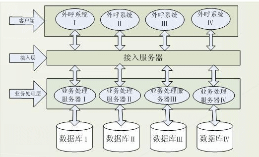 針對舊外呼業(yè)務(wù)系統(tǒng)的弊端及業(yè)務(wù)系統(tǒng)特點,賽迪呼叫研發(fā)了基于三層C/S結(jié)構(gòu)的外呼業(yè)務(wù)系統(tǒng),該系統(tǒng)分客戶端,接入服務(wù)器,業(yè)務(wù)服務(wù)器及數(shù)據(jù)庫端?蛻舳税l(fā)送請求給分配服務(wù)器,接受到請求后,分配服務(wù)器根據(jù)客戶端的請求數(shù)據(jù)將其分配給自身的業(yè)務(wù)服務(wù)器做業(yè)務(wù)處理,這樣客戶端與業(yè)務(wù)服務(wù)器建立起聯(lián)系,結(jié)構(gòu)體系如圖:
