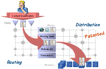 CCD智能呼叫分配器對(duì)經(jīng)過(guò)呼叫特性鑒別并進(jìn)入引導(dǎo)系統(tǒng)的呼叫,通過(guò)路由選擇矩陣進(jìn)入不同的等待隊(duì)列,并由第二個(gè)雙向分配矩陣進(jìn)行資源選擇或呼叫選擇。CCD先進(jìn)的雙矩陣分配方式,通過(guò)其獨(dú)特的技巧和費(fèi)用最低的路由算法來(lái)管理呼叫業(yè)務(wù)和資源,其性能超過(guò)當(dāng)前工業(yè)標(biāo)準(zhǔn)。這種呼叫分配算法的顯著特點(diǎn)之一是恰到好處地分離路由選擇、資源分配以及選擇呼叫三個(gè)過(guò)程,使其既相對(duì)獨(dú)立,又靈活選擇。而傳統(tǒng)的“矢量分配”法的主要缺點(diǎn)是僅從呼叫的觀點(diǎn)描述處理,缺乏對(duì)正空閑的資源該做些什么加以控制。