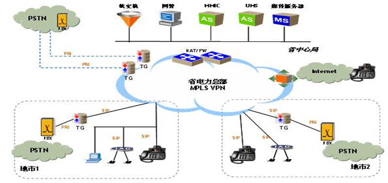 上海貝爾阿爾卡特的VoIP行業(yè)應用解決方案可以幫助電力行業(yè)用戶提供可定制、可管理的VOIP增值業(yè)務,包括IP Centrex、VPN、IP多媒體會議、Web 呼叫中心、一號通、Web800、統(tǒng)一消息、電子商務等多種業(yè)務。網絡拓撲圖如下: