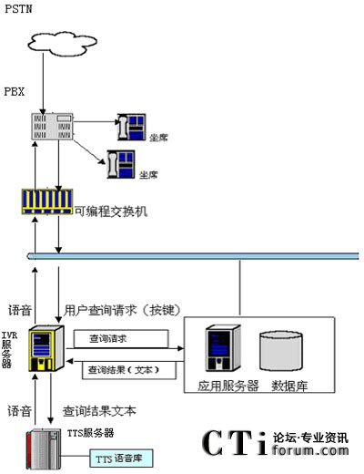 用戶(hù)撥打統(tǒng)一特服號(hào)碼進(jìn)入客戶(hù)服務(wù)系統(tǒng),經(jīng)過(guò)自動(dòng)語(yǔ)音系統(tǒng)提示,選擇公共信息查詢(xún)項(xiàng)目。用戶(hù)可以通過(guò)電話(huà)提交他的查詢(xún)請(qǐng)求(比如使用按鍵方式),IVR服務(wù)器收到請(qǐng)求后會(huì)向其他應(yīng)用服務(wù)器提交此查詢(xún)請(qǐng)求,當(dāng)IVR得到查詢(xún)結(jié)果后,他會(huì)將文本形式的查詢(xún)結(jié)果交給jTTS服務(wù)器,jTTS服務(wù)器會(huì)返回查詢(xún)結(jié)果的語(yǔ)音形式,最終語(yǔ)音會(huì)在坐席上播放,用戶(hù)就可以聽(tīng)到他剛才所要查詢(xún)的信息。